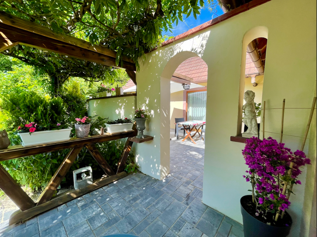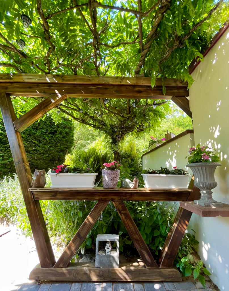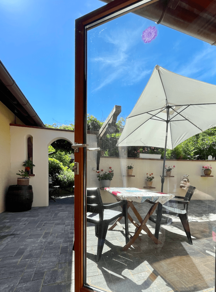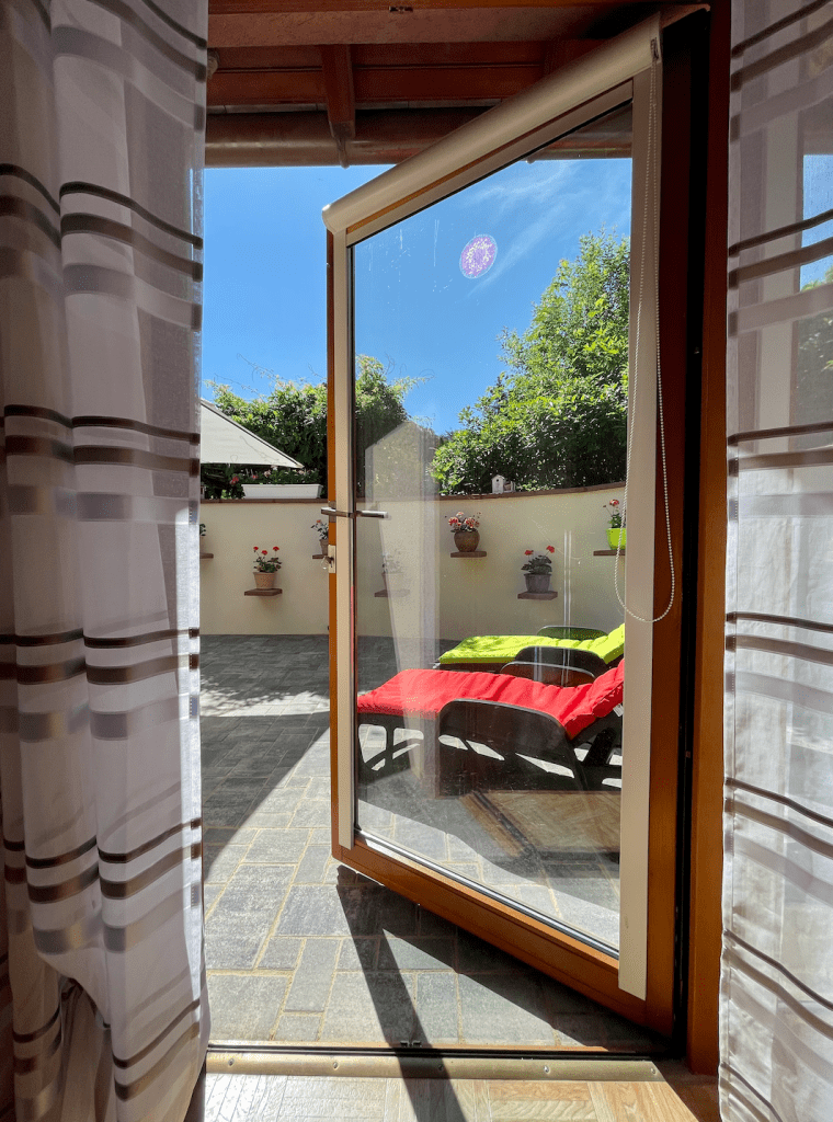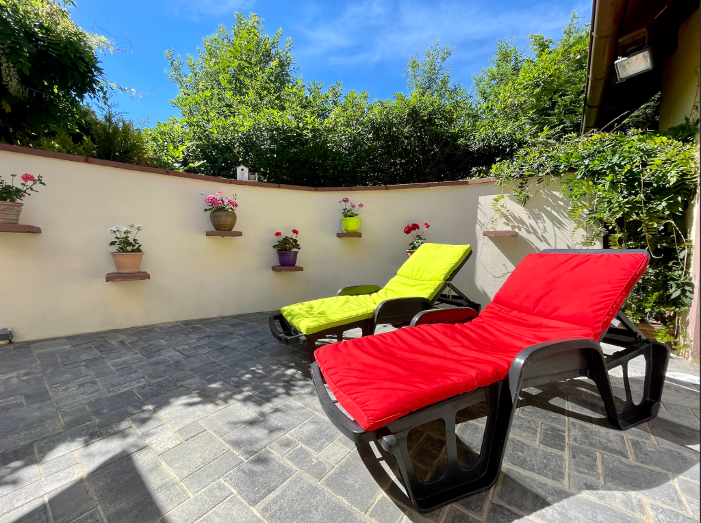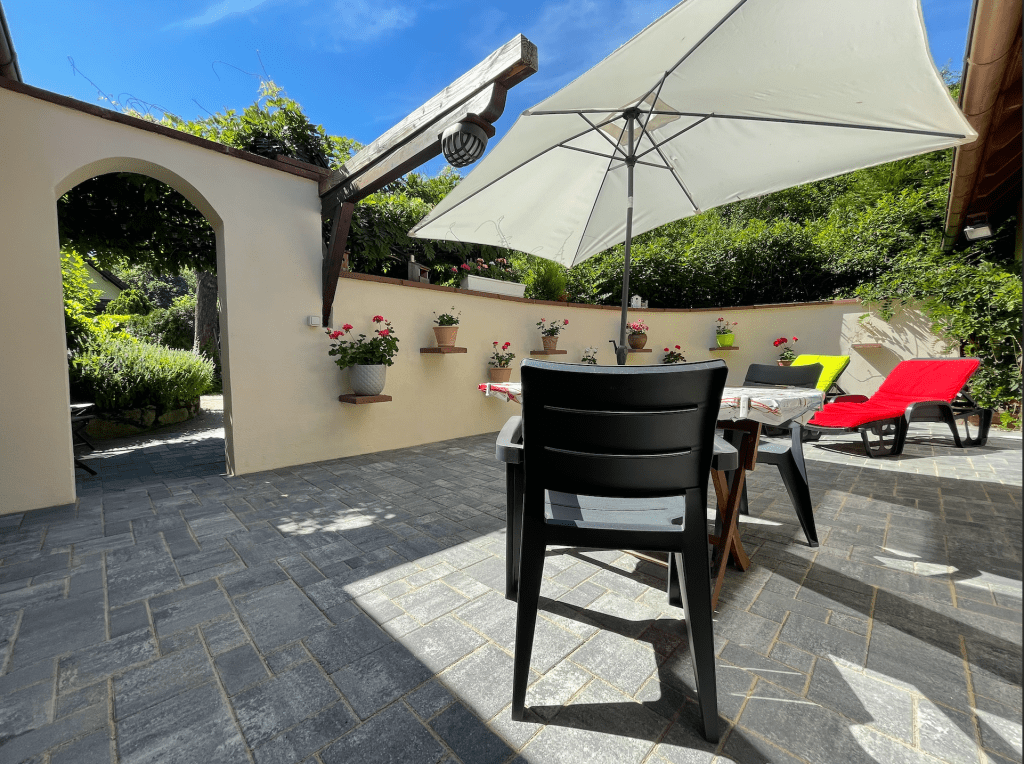 - ⛱ Terrasse extérieure 30 m2, meubles de jardin chaises longues parasol.