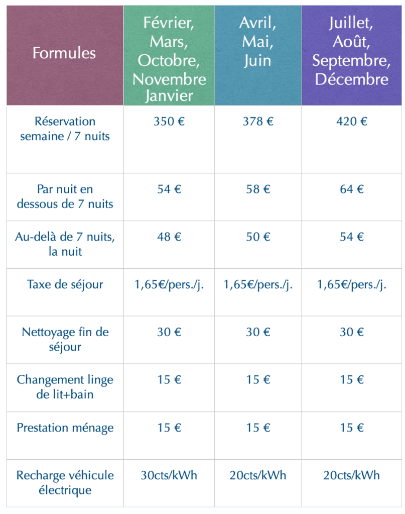 - Taxe de séjour 1€65/nuit/par personne (comprise dans le forfait ménage)